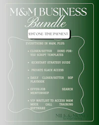 M&M is your complete remote high-ticket sales training program built for parents who want to create real income from home. We teach you how to close deals confidently, build skill that pays for life, and step into a career that gives you freedom, no marketing degree required. You’ll master everything from sales psychology and objection handling to offer breakdowns, DM conversations, and live roleplay training. Plus, you’ll have the chance to become an M&M affiliate and earn 85% profit sharing along the way.