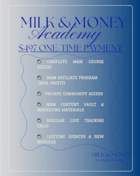 Earn while you learn with our affiliate program. You’ll have the opportunity to promote Milk & Money Academy for 85% profit; meaning your $497 investment can pay for itself fast and then some.